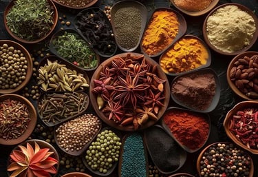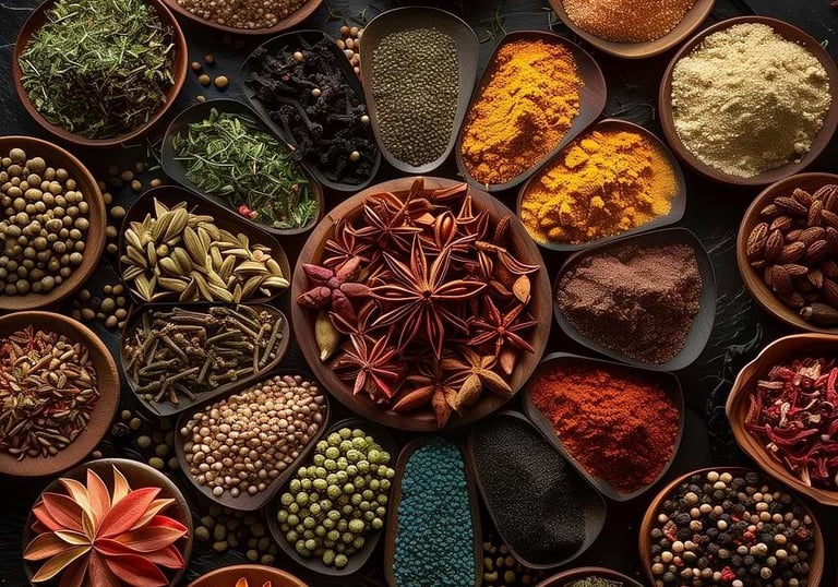 Freshly sourced spices like cardamom and turmeric, packed with flavor.